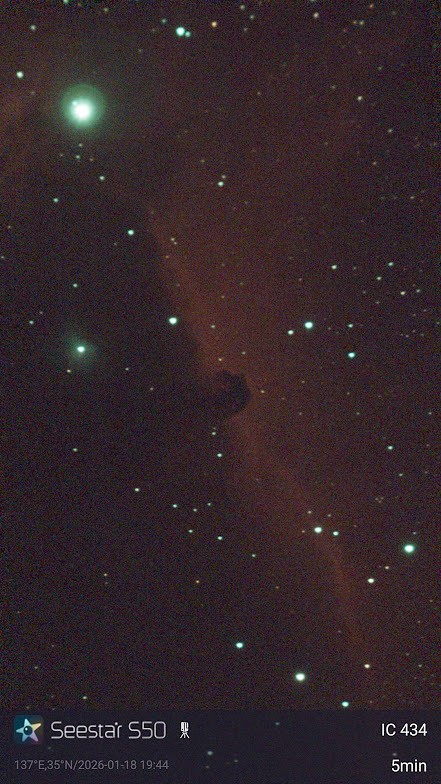 安易な電子観望で、シャープさはいま一つですが、子供のころから憧れ一度は撮影してみたいと思っていた「馬頭星雲」が撮れて満足。